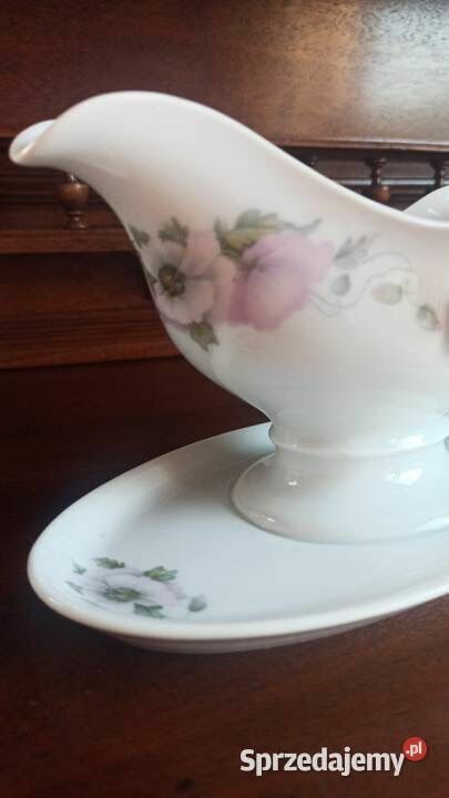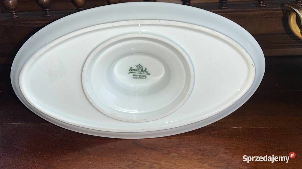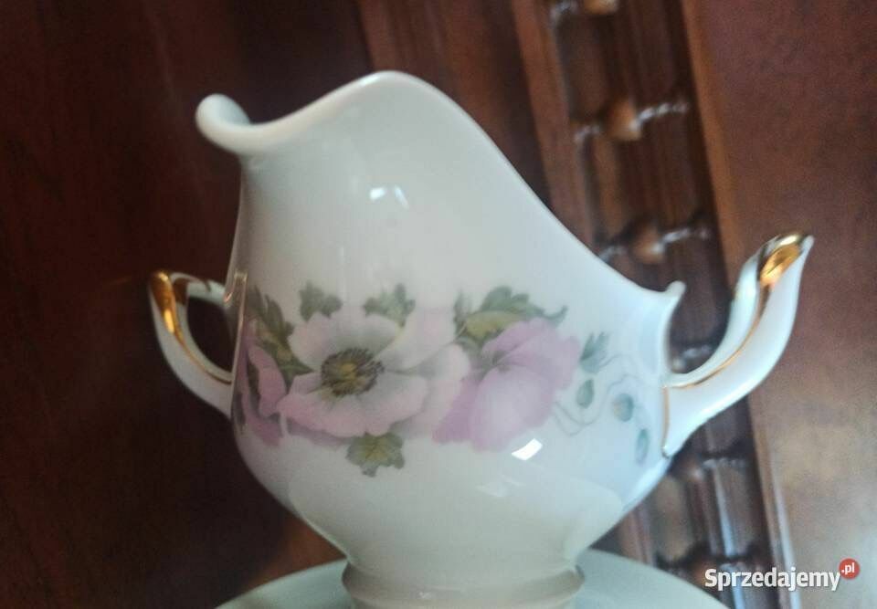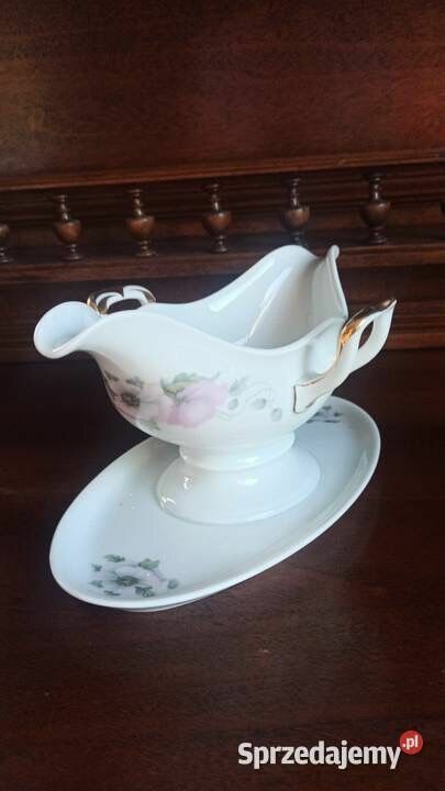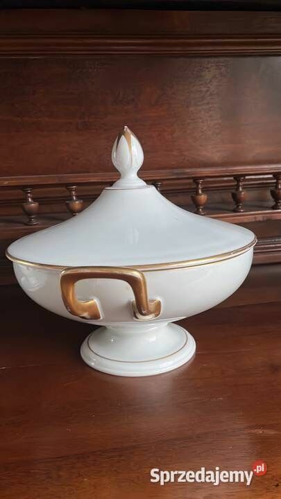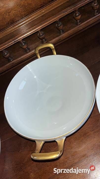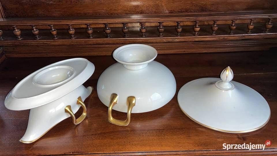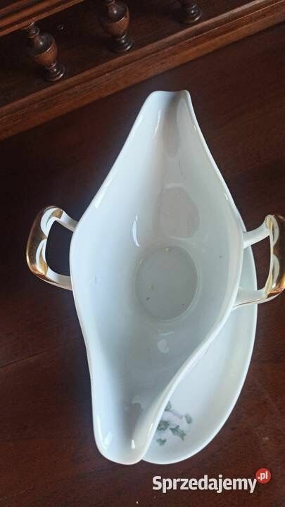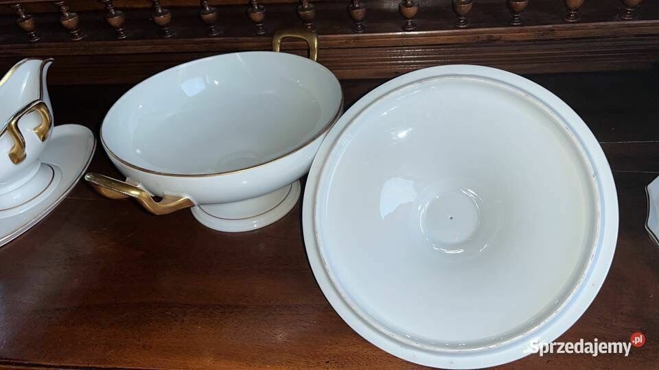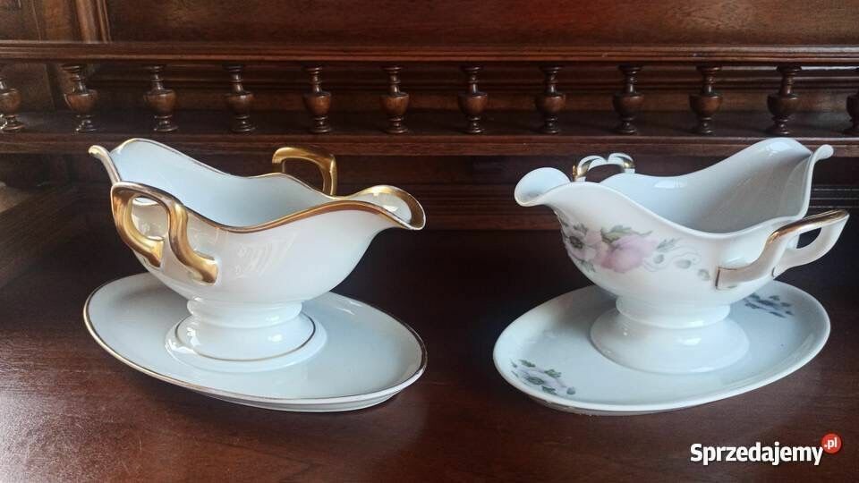 Biała porcelana ze złoconymi krawędziami i druga, sosjerka