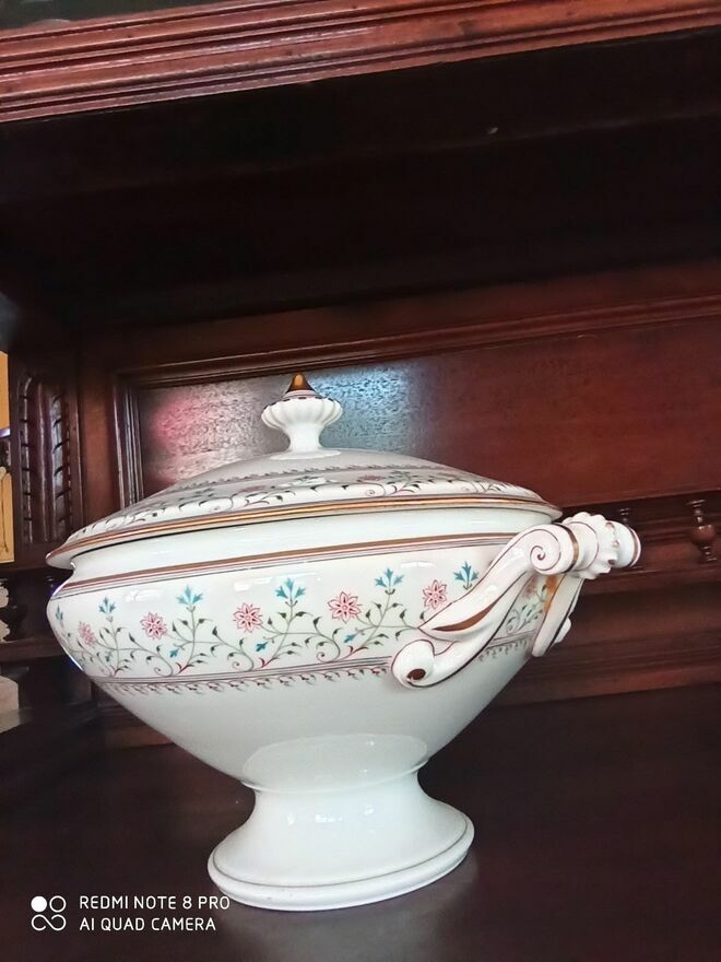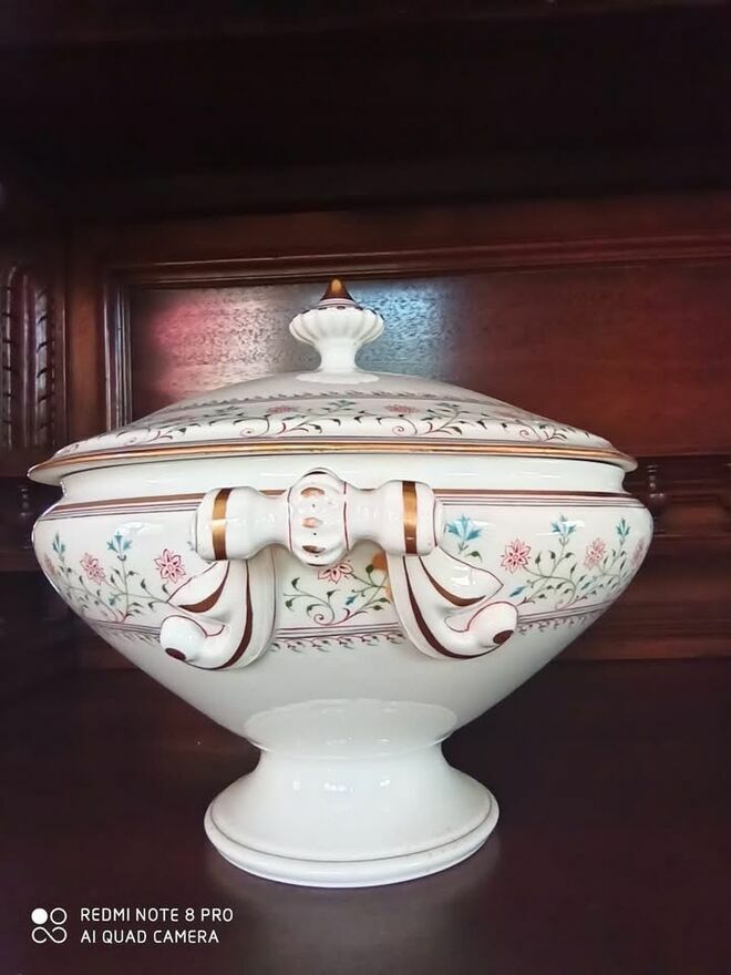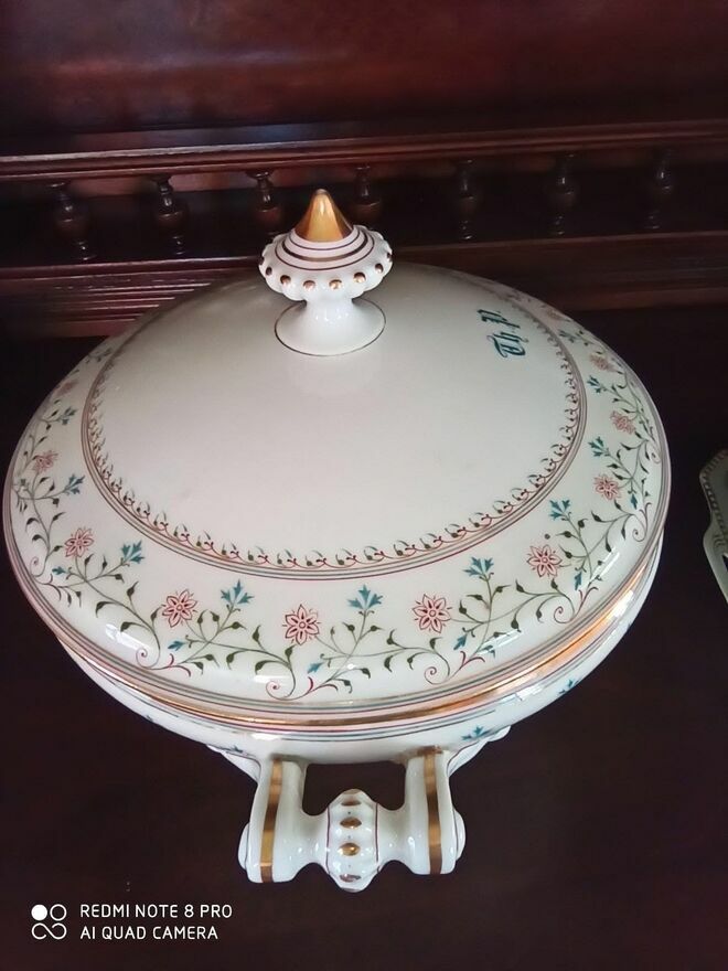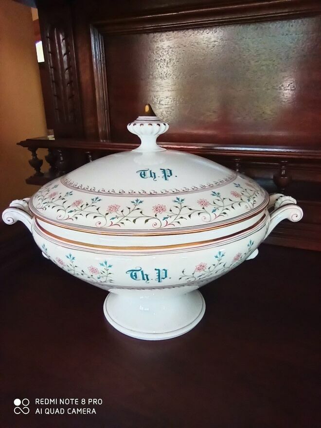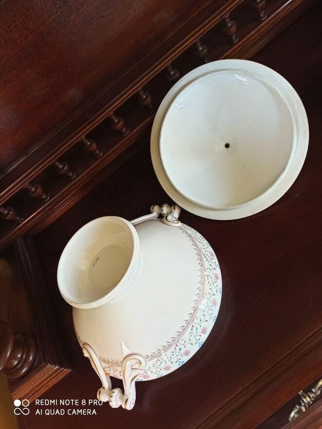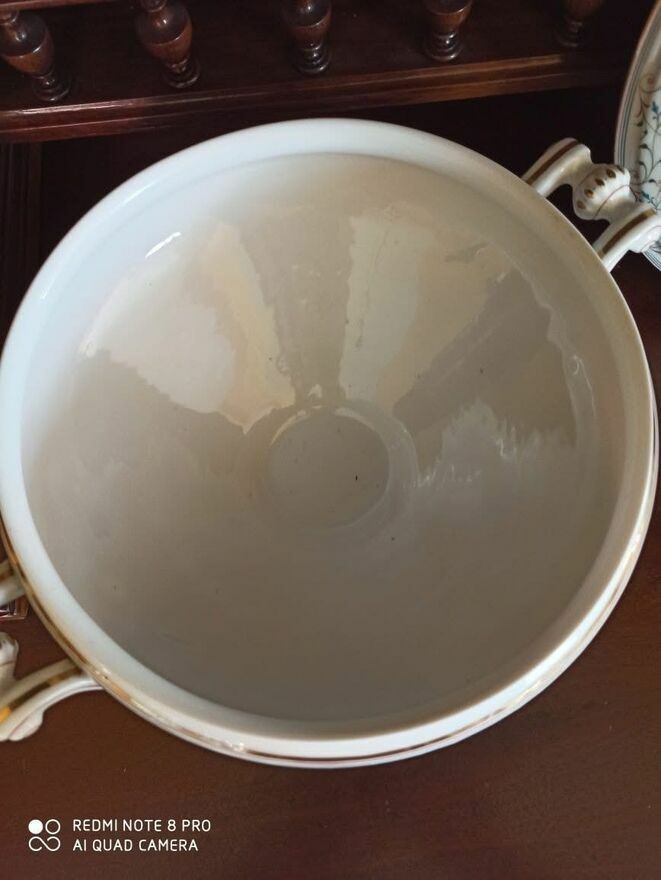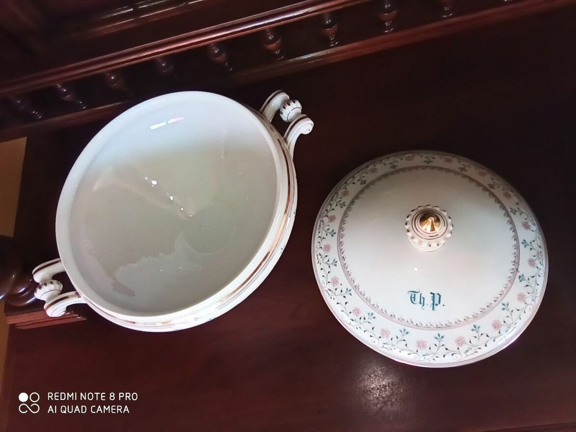 Waza z monogramem Th. P. Zamiast typowej sygnatury złotymi literami D. 1059.Przepiękna biała porcelana, z delikatnym dekorem kwiatowym na pokrywce i górnej krawędzi misy.