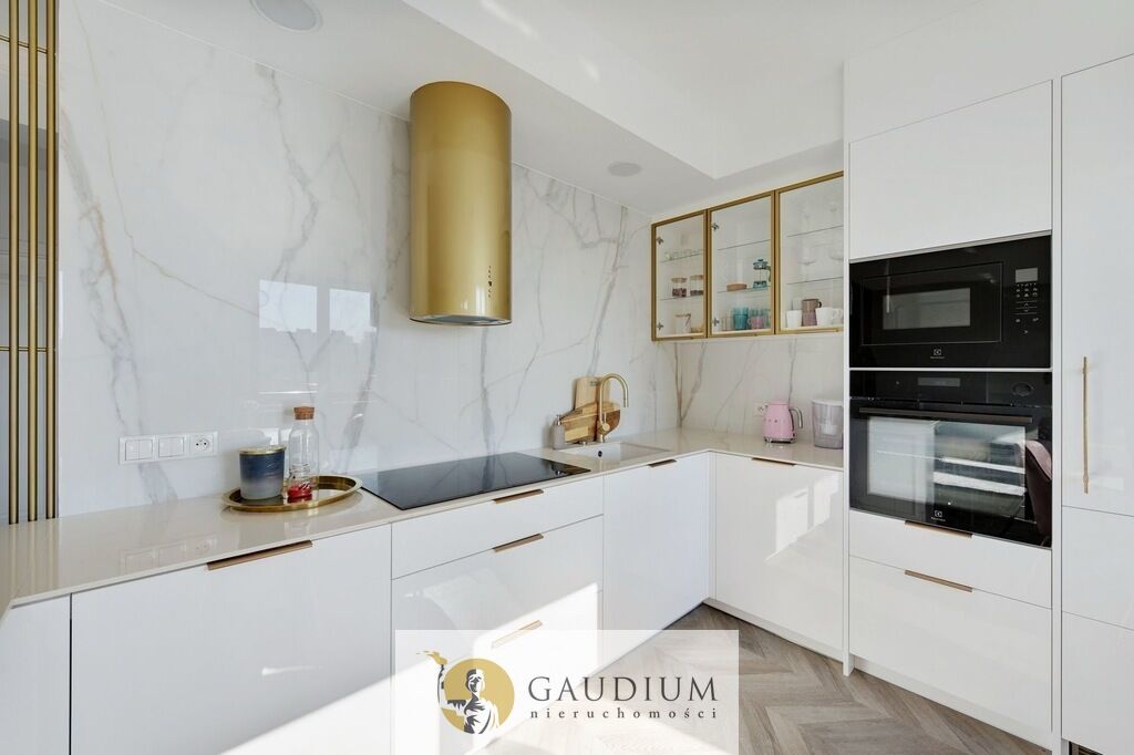 złoty okap. W salonie znajduje się duża, komfortowa kanapa, a